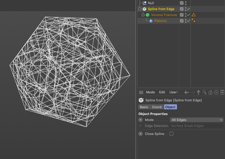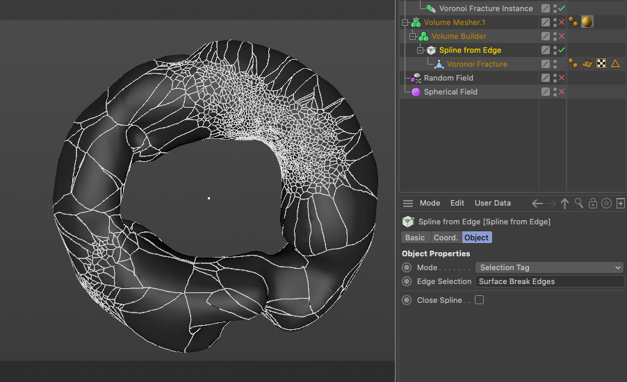 This Cinema 4D Generator allows you to create non-destructive Splines based on geometry. You can convert all mesh edges or a selective part using the Selection Tags. Together with Fields you can create any kind of animated effects and transfer them to a Spline. Build organic structures, add additional patterns on your design or use it in between your complex setups. Spline from Edge helps you to stay procedural.